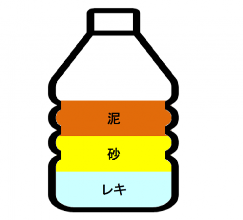 レキ、砂、泥と水をペットボトルに入れ、よくふり混ぜます。